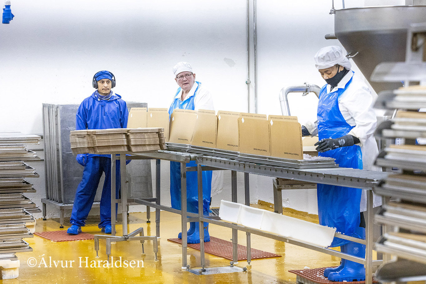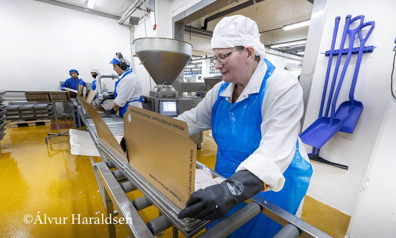 Síðani hon byrjaði, hevur Henny Olsen staðið við pakkibandið. Tær eru seks í pakkitoyminum. Ein lyftir pannurnar á pakkibandið, og ein tekur tær av aftur. Við pakkibandið eru fýra uppgávur, fyrst verður pakkitilfarið sett í stálrammuna, farsið verður vigað, síðani verður tað slættað, og til seinast verður lok koyrt á. Síðani verður pannan lyft á vognin. Tað er pláss fyri 28 pannum á vogninum. Tá vognurin er fullur, verður roterað, soleiðis at tær skiftast um tær fýra uppgávurnar á pakkibandinum.