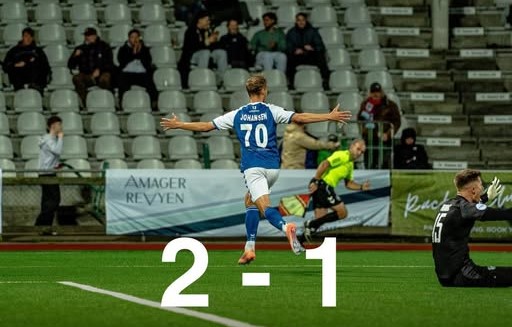 Andrass var skiftur inn frá byrjanina av seinna hálvleiki, og tað loysti seg hjá Fremad Amager. Tí í 65. minutti skoraði Andrass sigursmálið til 2-1. Á samansettu myndini sæst Andrass fegnast um málið.