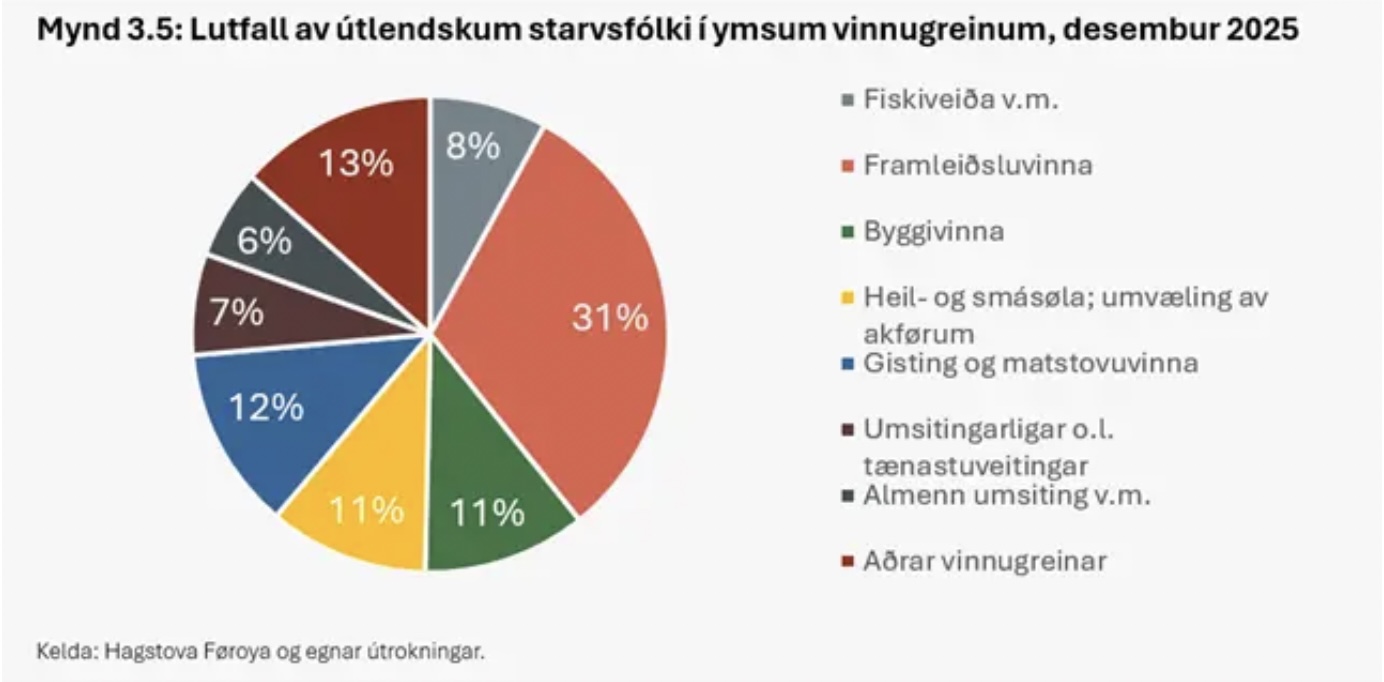 Meginparturin av útlendingunum, ið eru komnir til Føroya seinastu árini, eru fólk í arbeiðsførum aldri og tey eru áleið 8% av arbeiðsmegini í dag, ið svarar til stívliga 2.400 starvsfólk. Størsti parturin av útlendsku starvsfólkunum starvast innan framleiðsluvinnuna, sí mynd 1. Framleiðsluvinnan er millum annað matvøruídnaður (flakavirkir).