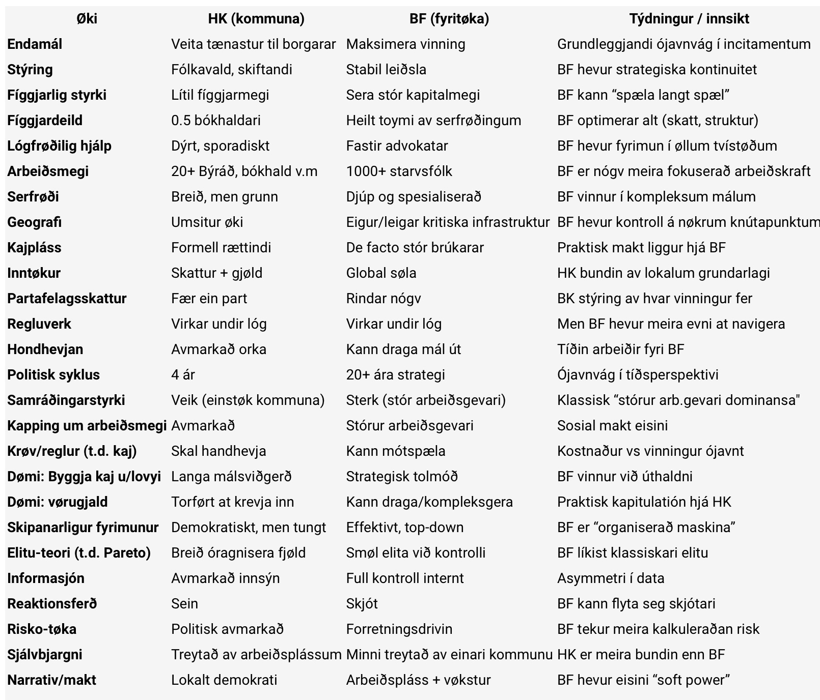 Hetta er ikki bara ójavnvágur – hetta er eitt ekstremt skeivt geografiskt býti av virði. Fyri at skilja hetta mugu vit hyggja eftir muninum millum Hvannasunds kommunu og Bakkafrost – hvørji endamál, veikleikar og styrkir tey hava.