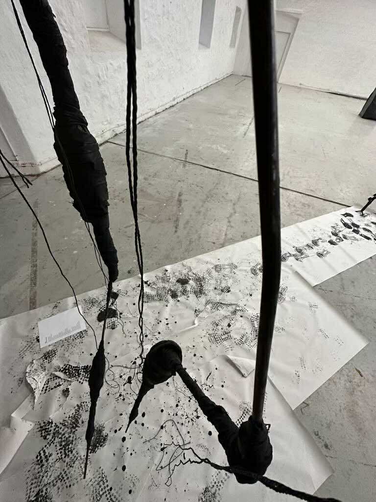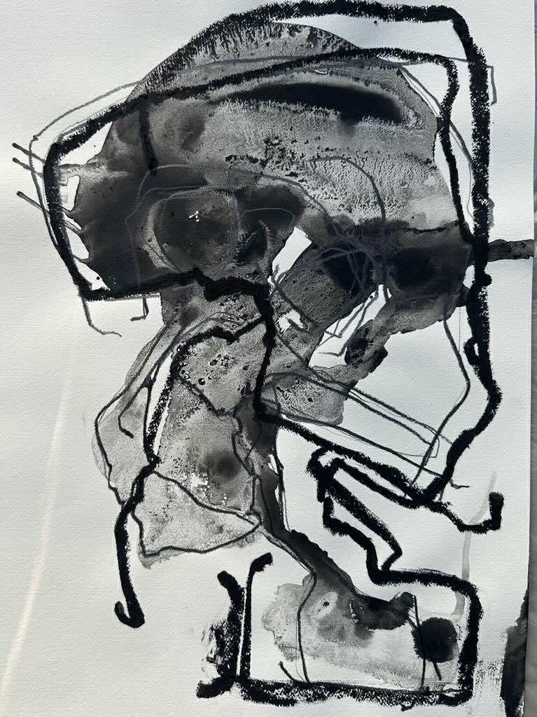Tilfarið, ið er vatn, grafitt, olja, sandur og pappír er partur av einum ráari, frummyndaligari listahugsan, har rørslan innskrivar seg beinleiðis í tilfarið. Verkini kykna tessvegna millum kropp og ætlan, millum tilfarsligt skilvísi og visuella kanning.