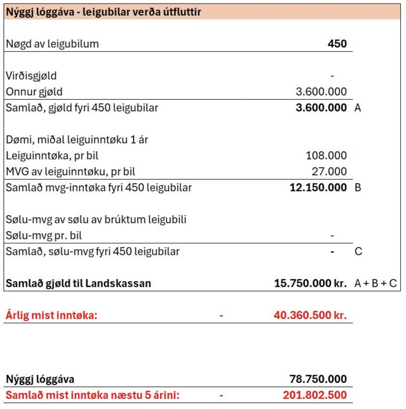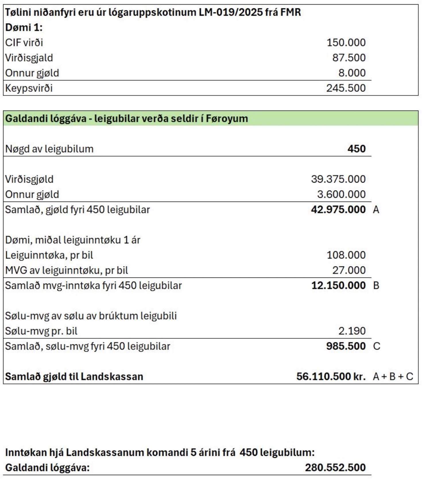 Greiðar útrokningar vísa, at lógarbroytingin fer at kosta landskassanum umleið 40 mió. krónur um árið. Orsøkin er einføld. Ein stórur partur av brúktu leigubilunum fer at verða seldur úr Føroyum, heldur enn til føroyskar keyparar.
