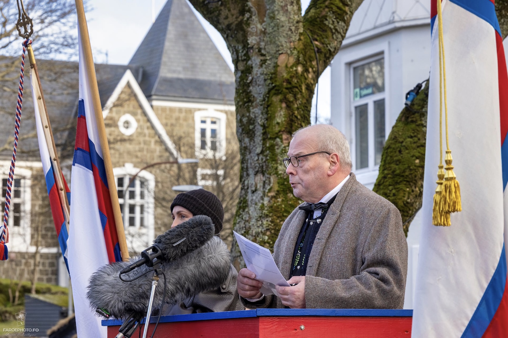 ”Órógv og umskiftilig viðurskifti herja heimin. Trupult er at vita hvat ið vendir upp og hvat ið vendir niður. Hvat ið er reytt og hvat ið er blátt og øvut. Eitt slag av klassiskari imperialismu hevur eisini tikið seg upp fyri eystan og vestan, autokratiskt hugsandi menn ynskja og royna at víðka um egið territorium, og ein avleiðing hjá okkum føroyingum er m.a., at vit hava sett í verk havnastongsul mótvegis einum av samstarvspartnarum okkara. Hvussu vit fara at navigera í eini meiri ókendari framtíð enn annars, tað er ilt at vita, men undir øllum umstøðum kunnu ráðini hjá Gandhi hjálpa okkum: ”…..onki teirra sleppur kortini at taka meg av fótum. Eg verði standandi í egnum jørðildi – á egnari grund.” Tann grundin er treytaleyst fólkaræði.”