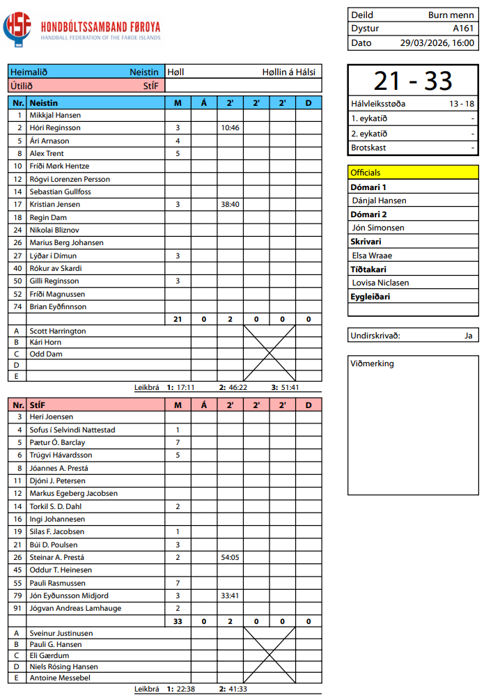 Í høllini á Hálsi í Havn vann StÍF stórsigur 33-21 á Neistanum. Í steðginum vóru strandingar á odda 18-13.