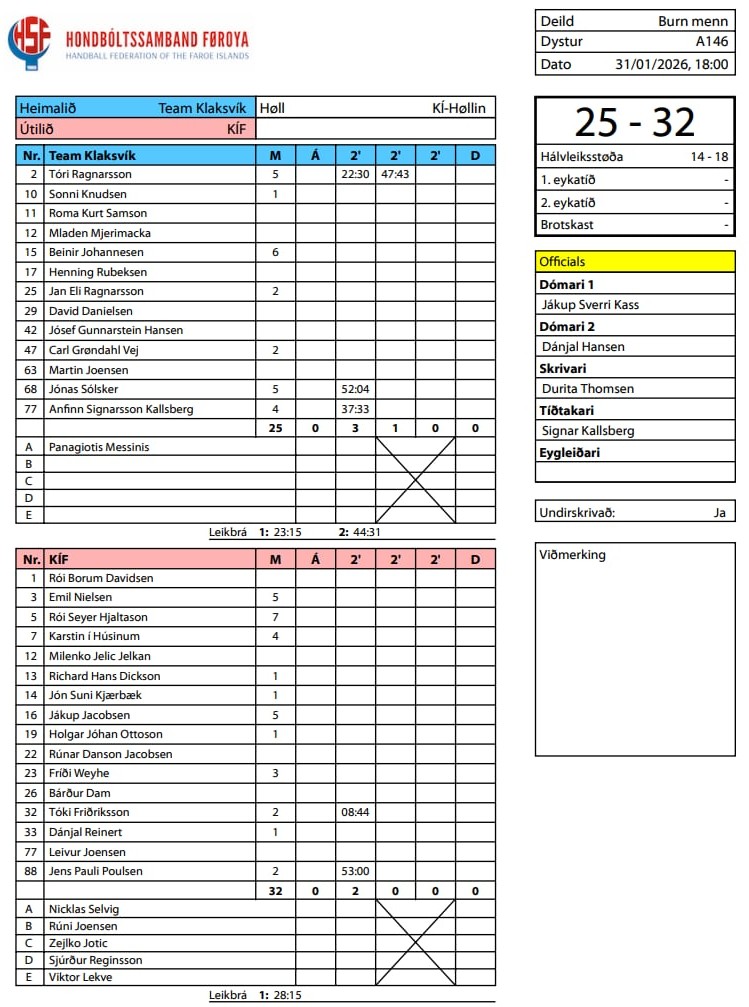 HER ber til frá HSF at síggja dómaraseðilin frá dystinum millum Team Klaksvík og KÍF, umframt støðuna í deildini: