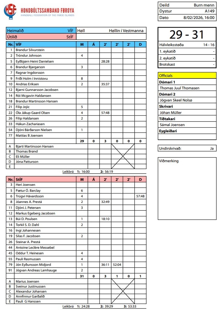 HER ber til frá HSF at síggja dómaraseðlarnar frá dagsins dystum, umframt støðuna: