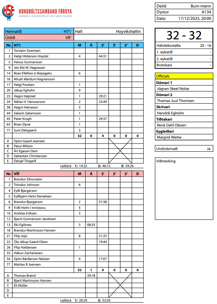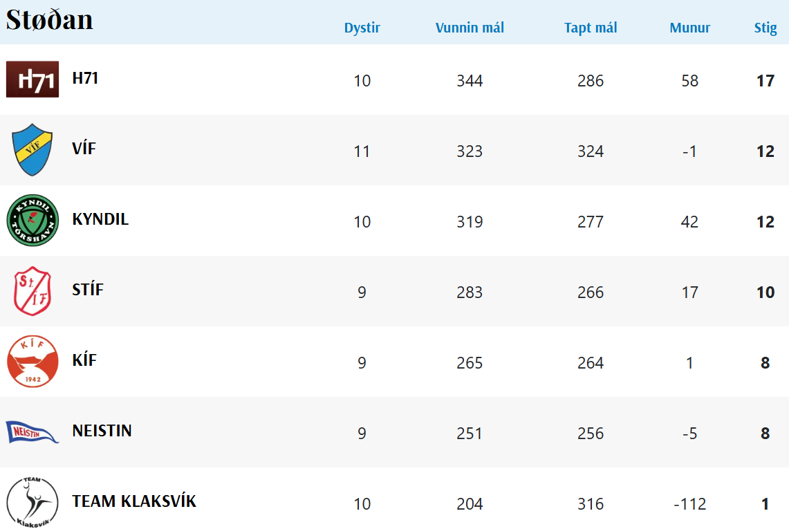 HER ber til frá HSF at síggja dómaraseðilin frá dystinum millum H71 og VÍF, og støðuna í deildini: