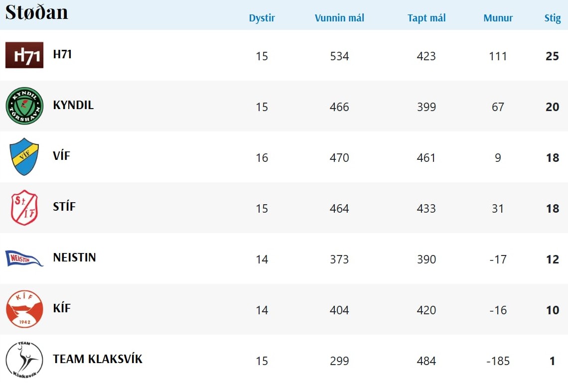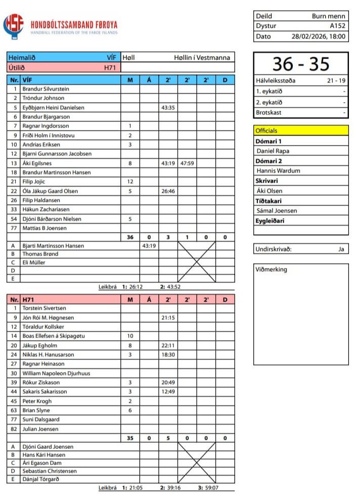 HER ber til frá HSF at síggja dómaraseðilin frá dystinum millum VÍF og H71, umframt støðuna í deildini: