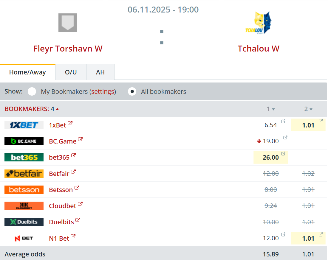 Miðaloddsini upp á útisigur til Tchalou eru so lág sum 1,01. Fleiri veddingarfyritøkur hava strikað oddsini upp á dystin, tí tað eftir teirra tykki er púra upplagt, at Tchalou vinnur á Fleyr í kvøld.