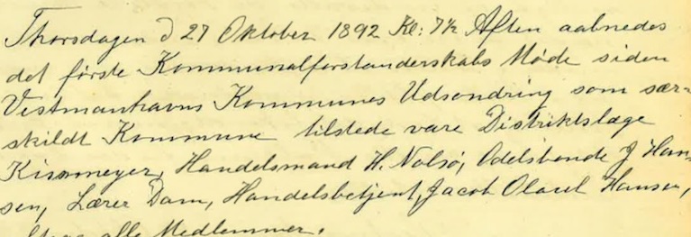 - Á fyrsta bygdarráðsfundi byrjar gerðabókin við, at hóskvøldið 27. oktober í 1892 klokkan hálvgum átta “åbnedes det første kommunalforstanderskabs møde siden Vestmanhavns kommunes udsondring som særskilt kommune.”