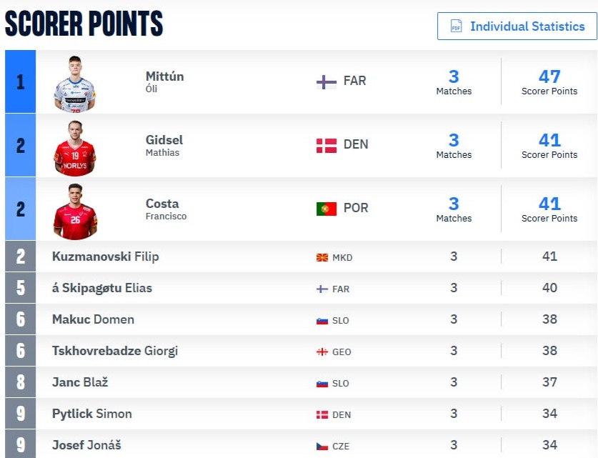 Óli hevur skotið øll síni 23 mál í opnum spæli, og á tí yvirlitinum er hann næstfremst. Bert danski stórleikarin, Mathias Gidsel við 25 málum í opnum spæli liggur hægri enn Óli á tí yvirlitinum.