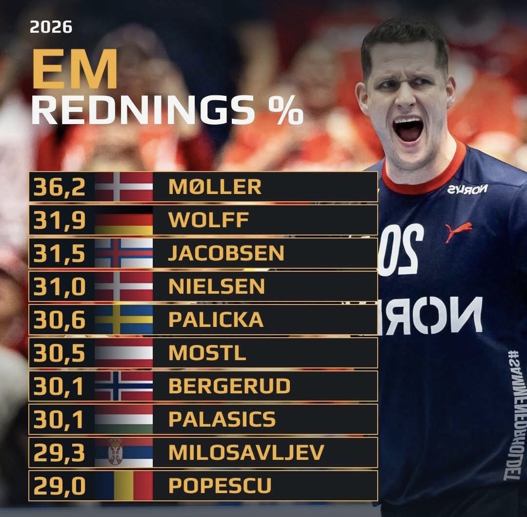 Fremst á yvirlitinum er danski Kevin Møller við 36,9 prosentum.