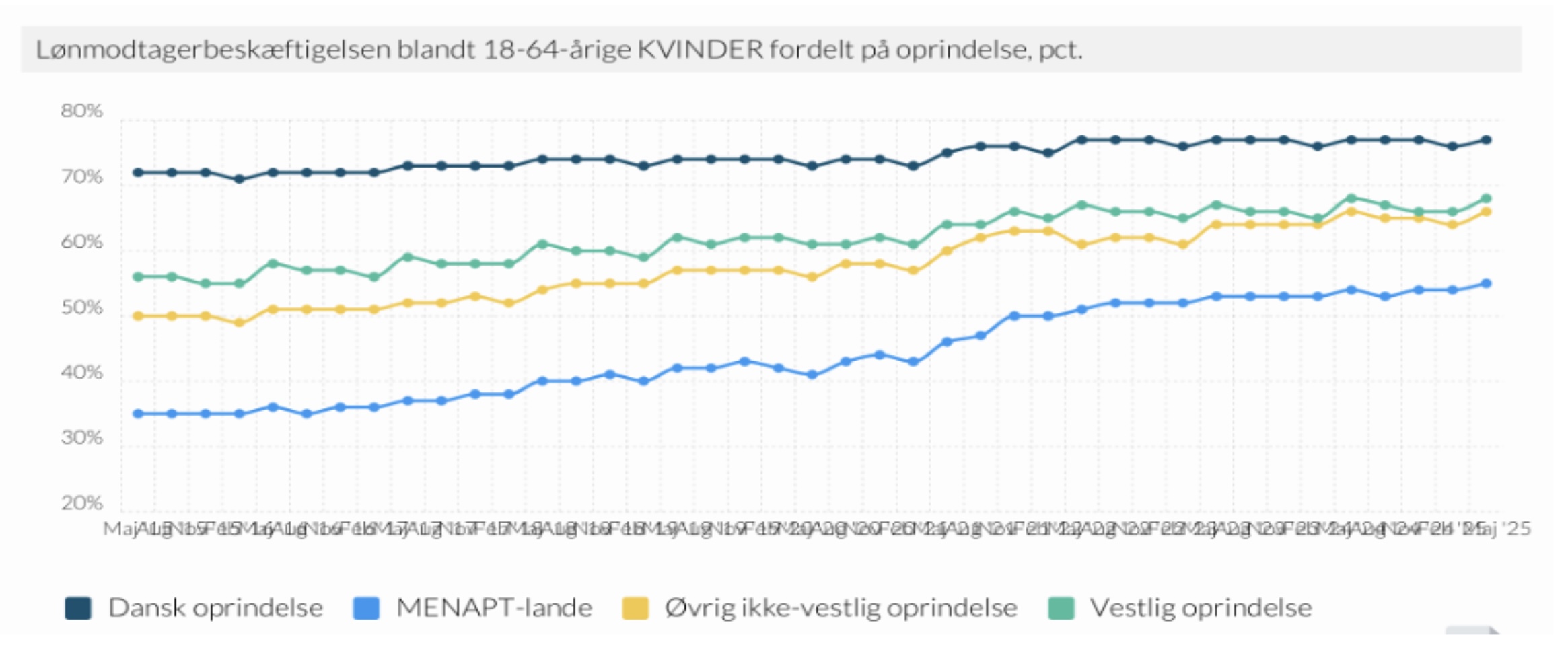 Hjá kvinnum úr MENAPT londum liggur arbeiðsføri á umleið 55%. Til samanberingar liggja danskar kvinnur á 77%. Hetta merkir ein mun í arbeiðstiltøk á gott 20 prosentstig.