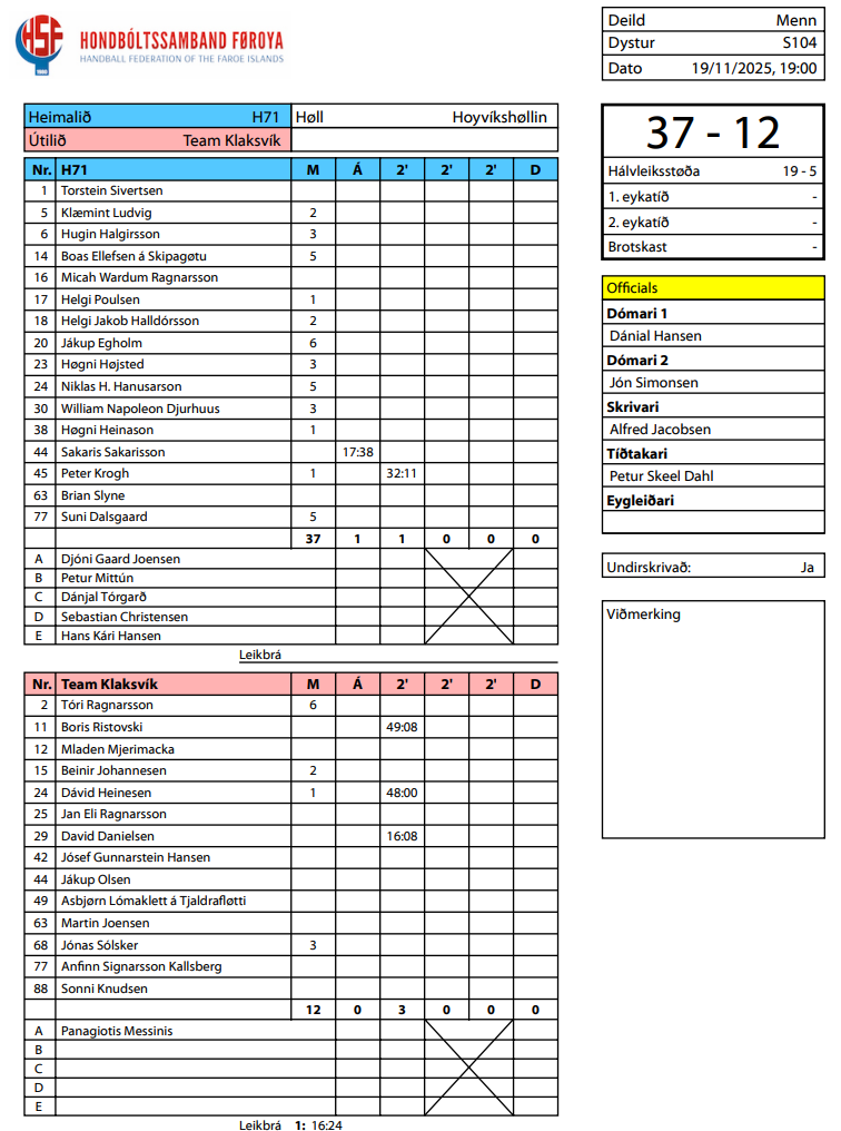 Í Hoyvíkshøllini vann H71 ein knúsandi 37-12 sigur á Team Klaksvík. Í steðginum var støðan 19-5.