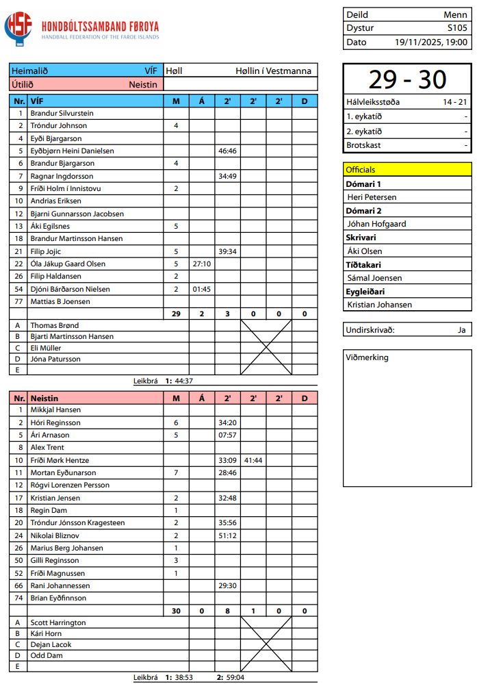 Í høllini í Vestmanna vann Neistin ein tepran 30-29 sigur á VÍF. Neistin var greitt á odda 21-14 í steðginum. Tá 46 minuttir vóru leiktir hevði VÍF minkað munin til 23-25. Við níggju minuttum eftir at leika hevði Neistin økt til 28-24. VÍF fekk tvær ferðir minkað leiðsluna hjá Neistanum niður í eitt mál, men nærri komu teir ikki.