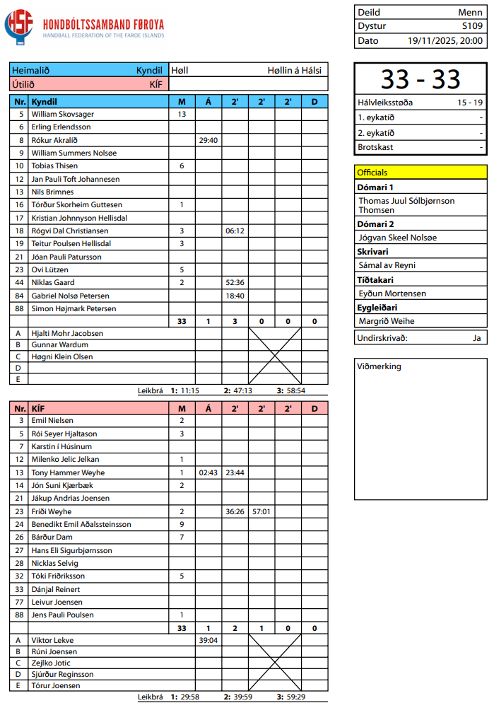 William Skovsager var við 13 málum stórskjútti hjá Kyndli. Toppskjútti hjá KÍF við níggju málum var Benedikt Emil Aðalssteinsson.