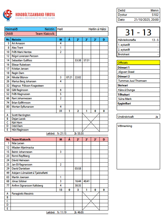 HER ber til frá HSF at síggja dómaraseðilin frá dystinum millum Neistan og Team Klaksvík: