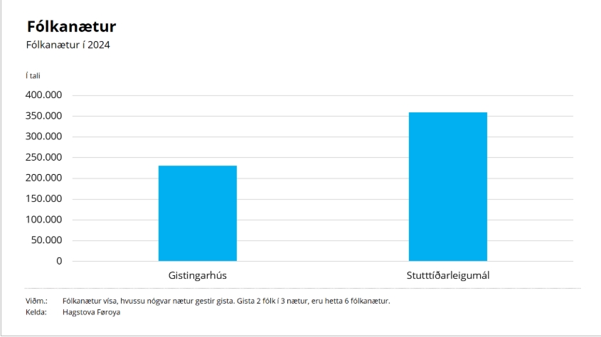 Nærum eins nógvir gestir gistu í stutttíðarleigumálum, eitt nú í sethúsum og íbúðum, sum á gistingarhúsunum í 2024. Hinvegin gistu munandi fleiri av útlendsku gestunum í stutttíðarleigumálunum, hetta skrivar Hagstovan, sum hevur gjørt tølini upp.