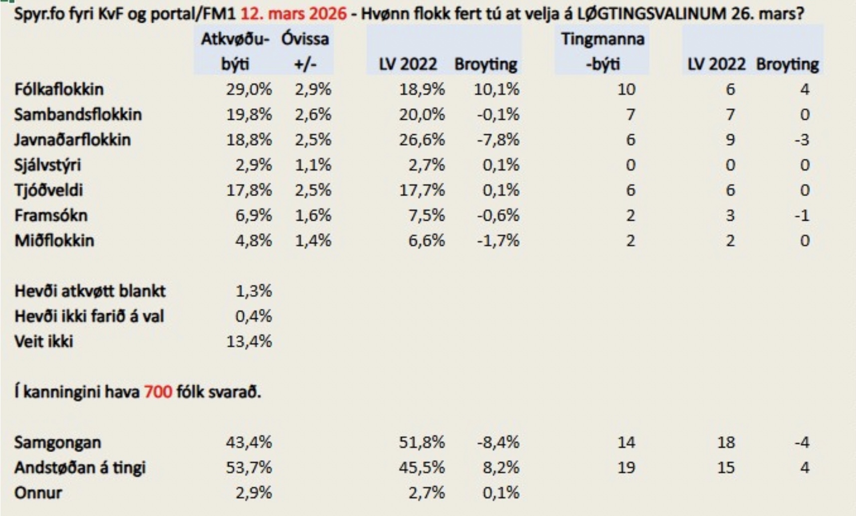 Kanningin gevur Fólkaflokkinum 29 prosent, sum er ein framgongd upp á 10,1 prosenststig. Tað gevur flokkinum 10 tingsessir.