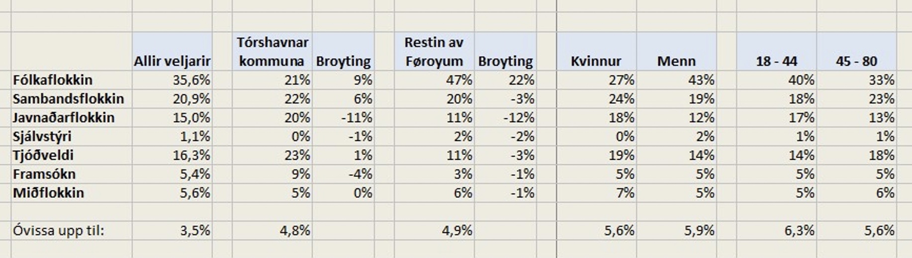 Hesi tøl liggja ikki úti, men Fólkaflokkurin tekur lutfalsliga mest frá smáu flokkunum Miðflokkinum, Sjálvstýri og Framsókn, men tekur eisini heilt nógv frá hinum stóru flokkunum, enntá andstøðufelagnum Sambandsflokkinum. Tað mesta, ið Sambandsflokkurin dregur inn í bakborði frá Javnaðarflokkinum missir hann í stýriborði til Fólkaflokkin.