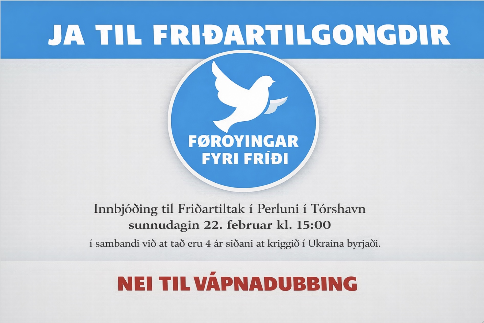 Friðarrørslan, Føroyingar fyri friði, bjóðar til aðalfund í Perluni í Tórshavn sunnudagin 22. februar 2026 kl. 14:00. Skrá sambært viðtøkum felagsins.