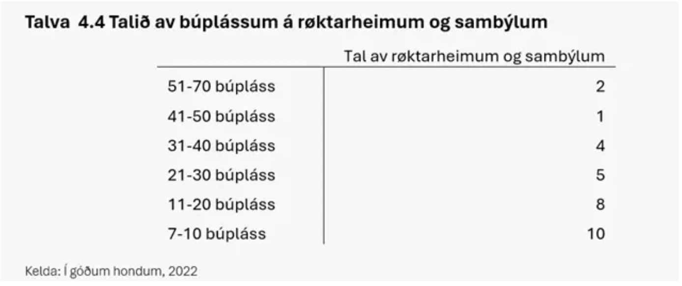 Í Føroyum hava heili 23 av 30 røktarheimum og sambýlum færri enn 30 búpláss, og 10 hava enntá 10 og færri búpláss, sí talvu. Tað er eyðsæð, at við fáum búplássum fyri hvørt røktarheim, verða normeringarnar lutfalsliga høgar og sostatt gerst raksturin fyri hvørt búpláss dýrari. Sí eisini stakdømið.