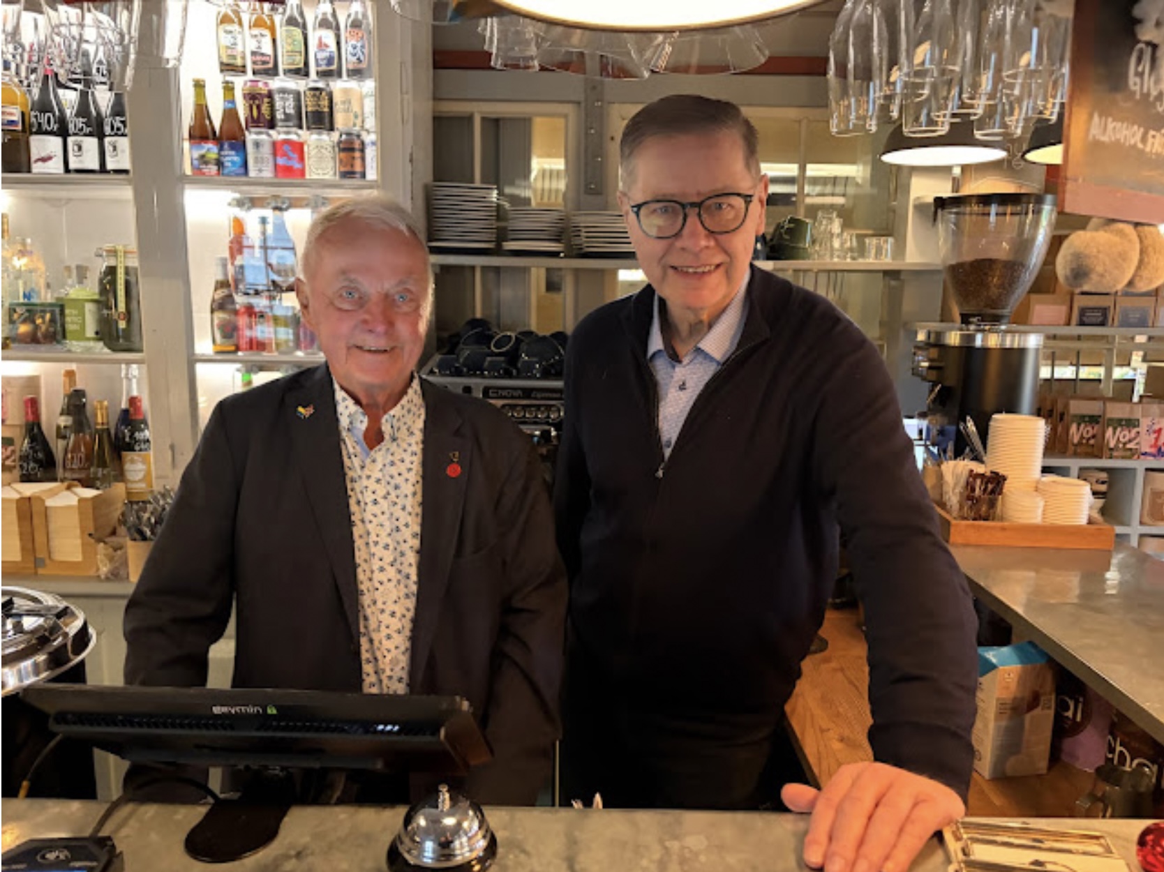 Beint sum eg havi avgreitt talgildu atkvøðuna, setir virkni grannin, Hans Jacob Hermansen, meg í samband við Bjørn Helge Hansen, formann í Eldraráðnum í Nordland, til vinstru við diskin í Paname omanfyri, og Eirik Fiva, til høgru, sum er úr Bodø og limur í Ráðnum. Teir vitja í Havn og fara í morgin til Reykjavíkar.