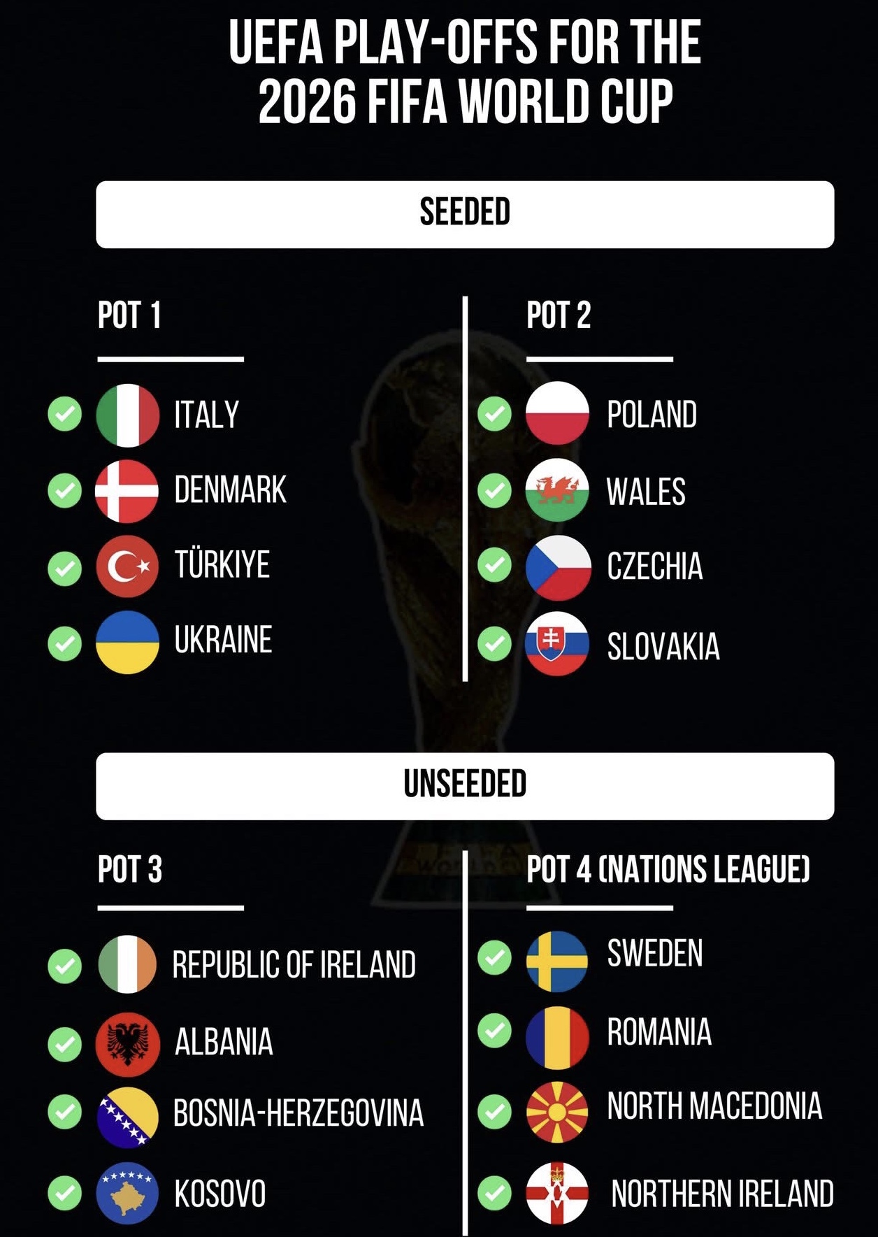 Tað vera 16 landslið, ið fara at kappast um tey fýra HM-plássini. Tey 16 liðini eru deild í fýra styrkisbólkur. Danmark er í ovasta styrkisbólkin, og fær í fyrra Play Off dystinum heimavøll í Parkini í Keypmannahavn.