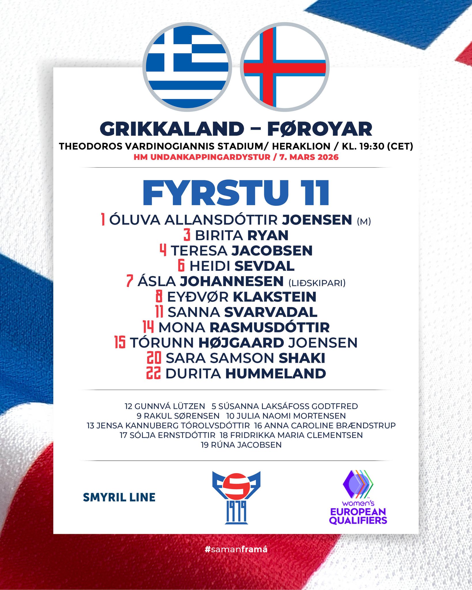 14. apríl hittast Føroyar og Grikkaland aftur á Tórsvølli. Eftir tað spæla Føroyar tveir dystir móti Georgia. Týsdagin vann Grikkaland á heimavølli 3-0 (1-0) á Georgia.