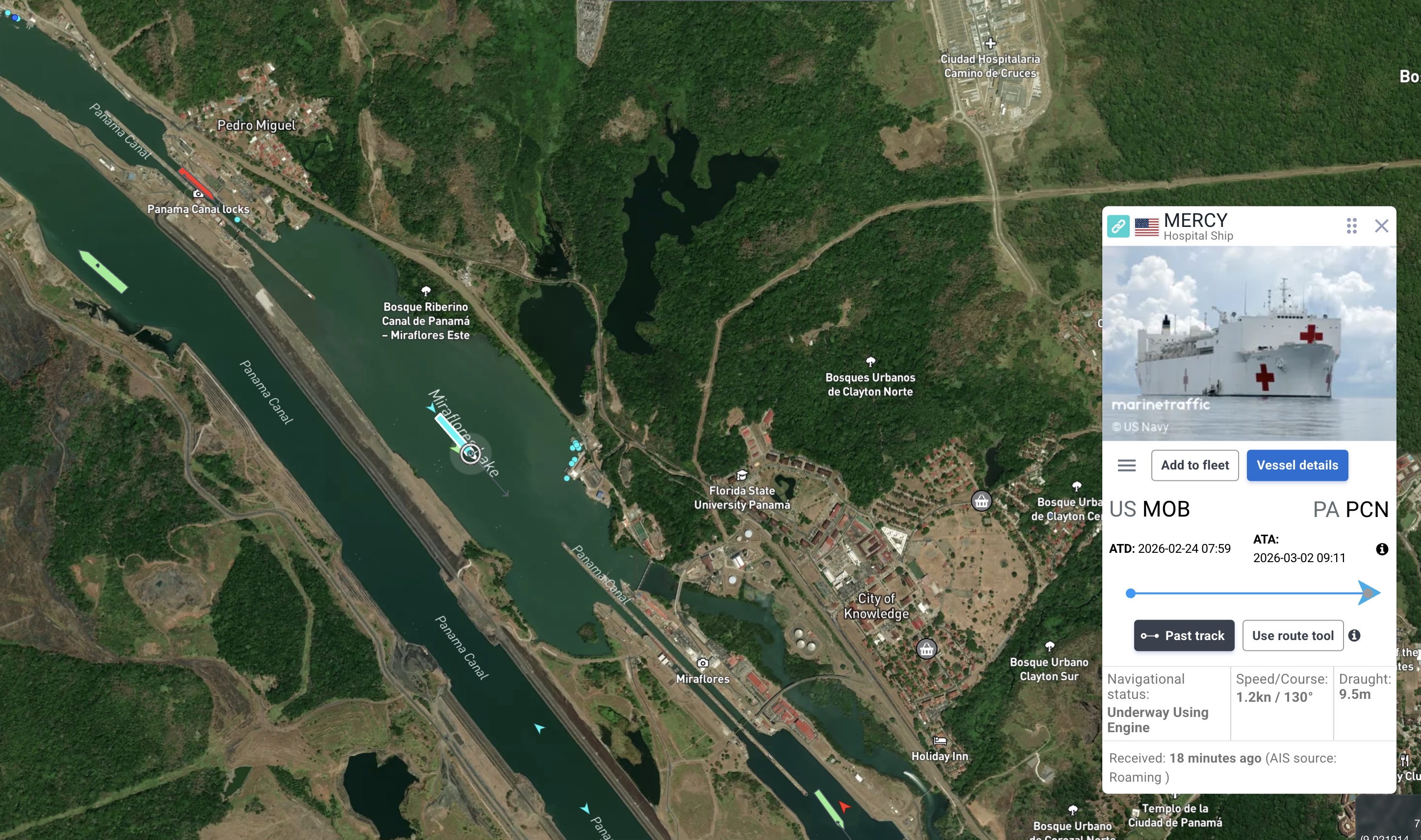 Her sæst "USNS Mercy" á marinetraffic.com í Panamaveitini