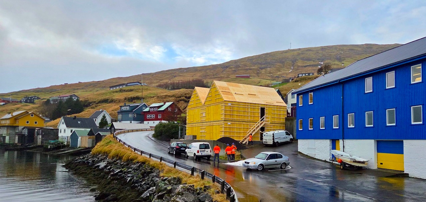 Ein nýggjur íbúðarbygningur er reistur í Vestmanna í morgun.