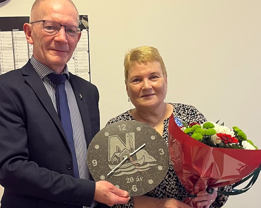 Í dag varð Irena Olsen, Nes, vaskifólk í Tofta skúla, heiðrað fyri síni 20 ár í starvi hjá Nes kommunu.