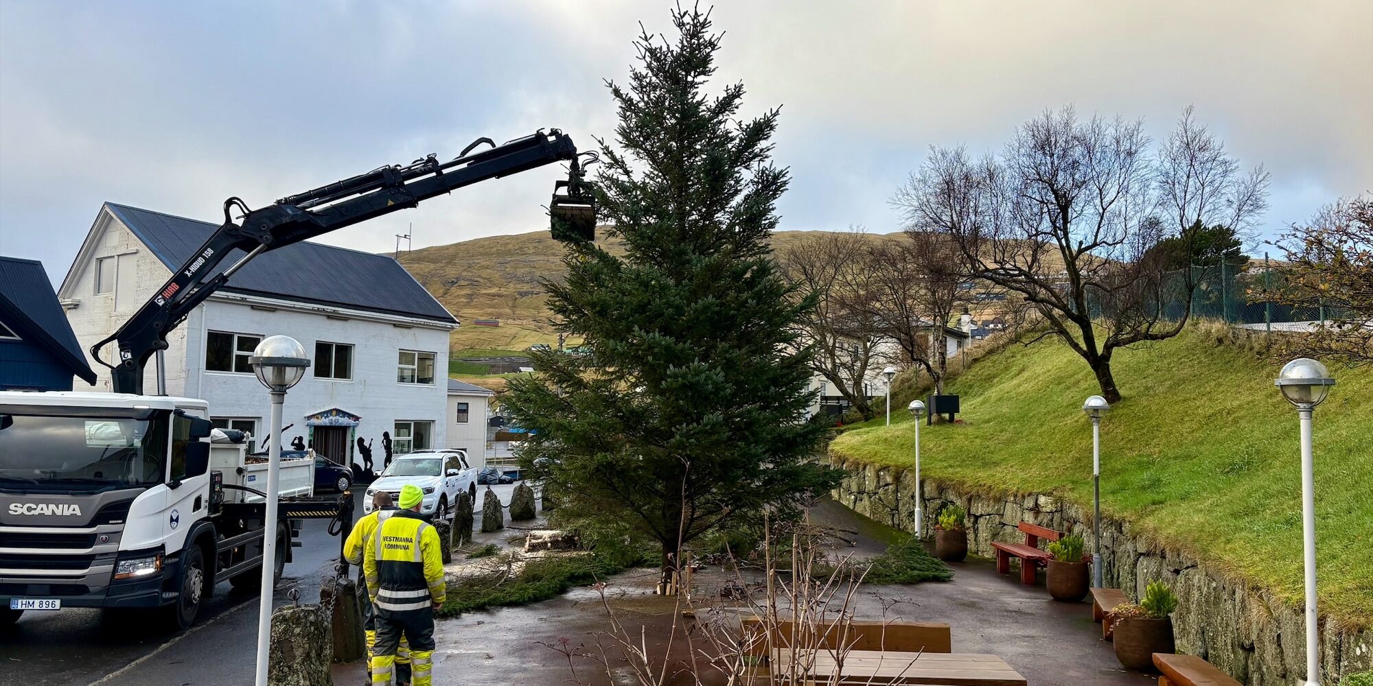 Fríggjadagin vóru arbeiðsfólkini hjá kommununi og feldu eitt granntræ í viðarlundini og í dag varð træið sett upp á Torginum, klárt til at verða prýtt við lýsandi perum.