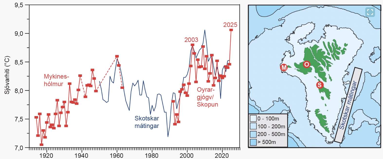 Hetta vísa mátingar, sum Havstovan regluliga ger við Oyrargjógv og Skopun. Umframt hesar mátingar eru eisini eldri mátingar frá Mykinesi, sum blivu gjørdar í tíðarskeiðnum 1914-1969. Í hesum tíðarskeiðnum var hitin so at siga javnt vaksandi fram til umleið 1960 (Mynd 1). Eftir hetta kólnaði tað aftur. Tað vísa skotskar mátingar eisini, sum eru gjørdar eystanfyri síðani 1950. Í 1991 byrjaði Havstovan at máta hitan í sjónum við Oyrargjógv. Hesar mátingar vísa, at hitin vaks nógv beint eftir aldarskiftið, og at sjógvurin bleiv met heitur í 2003. Síðani hevur hitin skift eitt sindur, men yvirhøvur verið rættuliga høgur. Nú hevur hitin gjørt eitt stórt lop, soleiðis at 2025 bleiv væl heitari enn 2003.