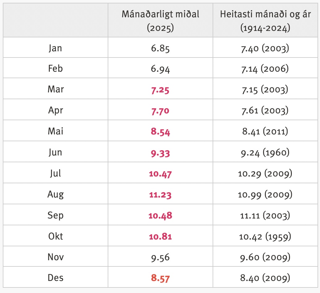 Níggju mánaðir í 2025 vóru eisini met heitir, umframt at met vórðu sett fyri heitasta dag. Árið 2025 er sostatt tað heitasta vit vita um á Landgrunninum, síðan mátingarnar byrjaðu í 1914.