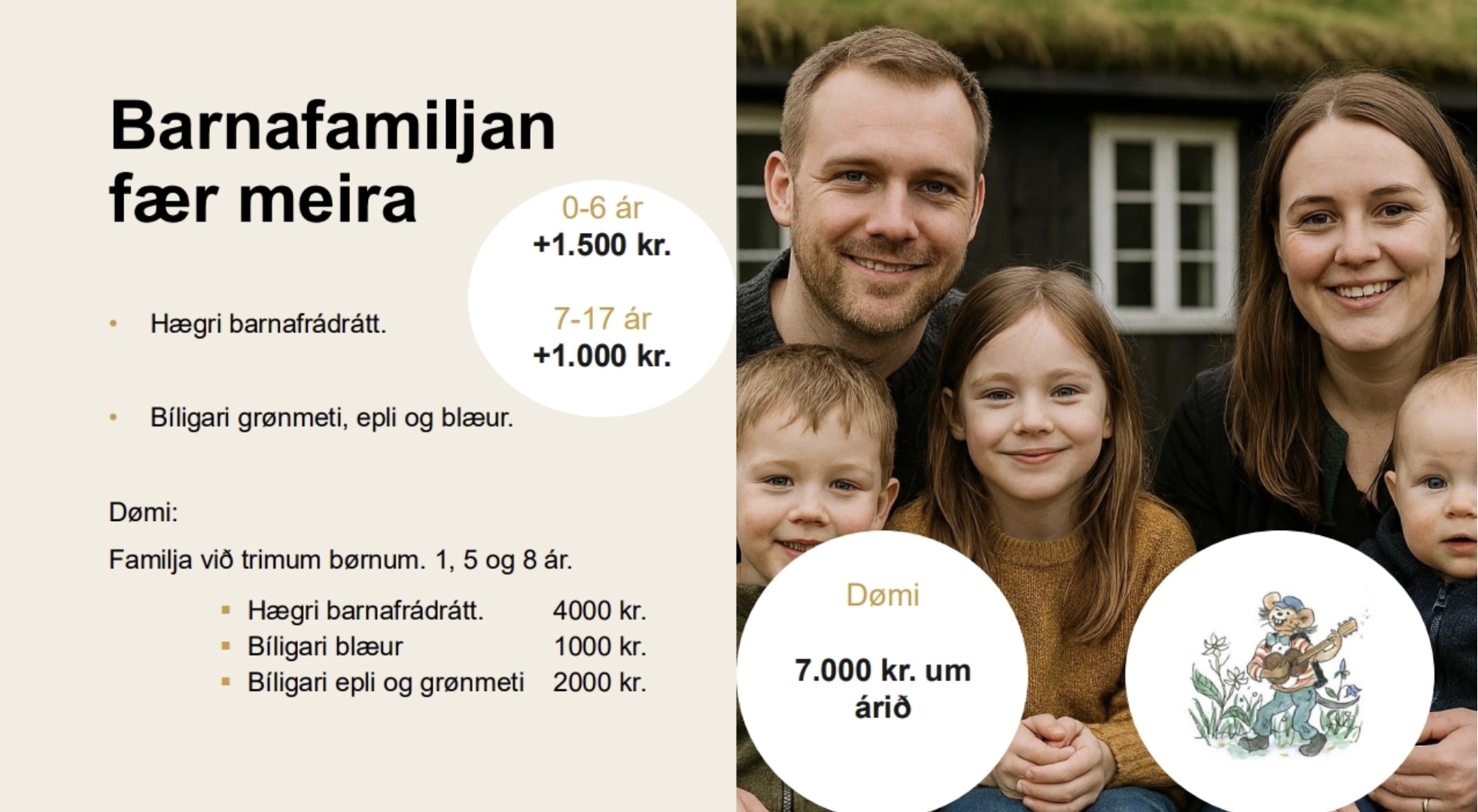 – Tað er sera týdningarmikið at skapa góðar og tryggar karmar rundan um barnafamiljurnar í Føroyum. Við at hækka barnafrádráttin og gera týdningarmiklar gerandisvørur bíligari vilja vit lætta um gerandisdagin hjá okkara yngstu borgarum og foreldrum teirra. Ein familja við trimum børnum sum eru 1, 5 og 8 ár fáa við hesum báðum uppskotinum 7.000 kr. meira at liva fyri um árið. Hetta kemur afturat skattalættanum, sum foreldrini fingu í 2024 og 2025, sigur Ruth Vang, landsstýriskvinna í fíggjarmálum.