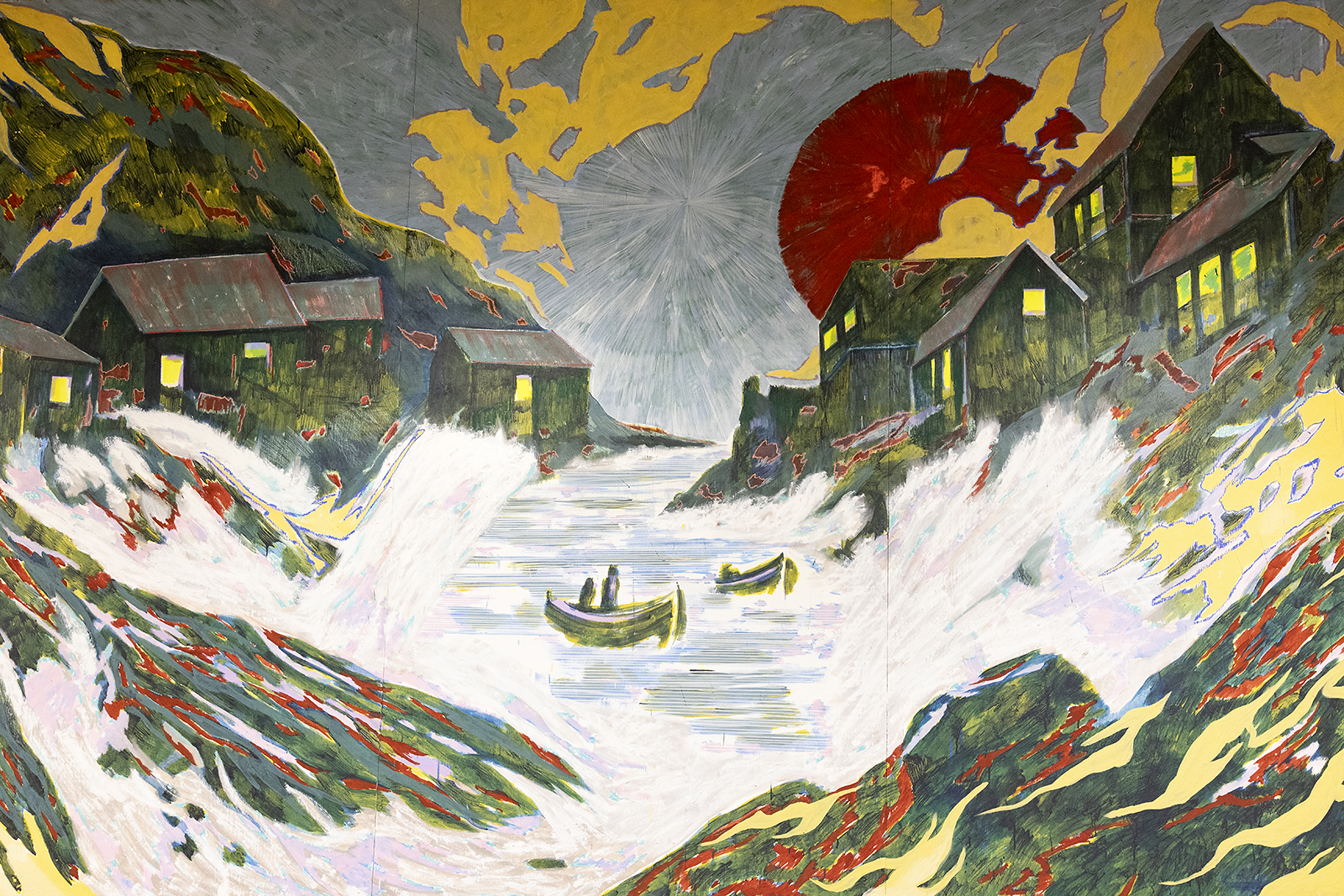 Myndirnar vera síðani leysari, minni defineraðar í miðjuni. Flótandi kroppar, svimjandi kroppar, sveimandi kroppar. Ljósreflektiónir og aldur, og streymur er rundan um fólkini. Miðjan er meira kensluborin og innanvend. Haraftrat er kompositiónin á myndini á eysturvegginum meira kompakt enn vinstrumegin. Súlur standa frammanfyri, so myndin verður deilt upp á tann háttin. Meðan vestursíðan er meira luftig. Á hendan hátt sipi eg beinleiðis til tekstin frá kunningini: “At kunna svimja undir himmalhválvinum móti óendaligu havsbrúnni – og at venda heim aftur til land okkara, ið hevjar seg grønt og bratt”. Men myndirnar avmynda eisini mínar egnu lívsroyndir, bæði sum listafólk og svimjari.”##med8##