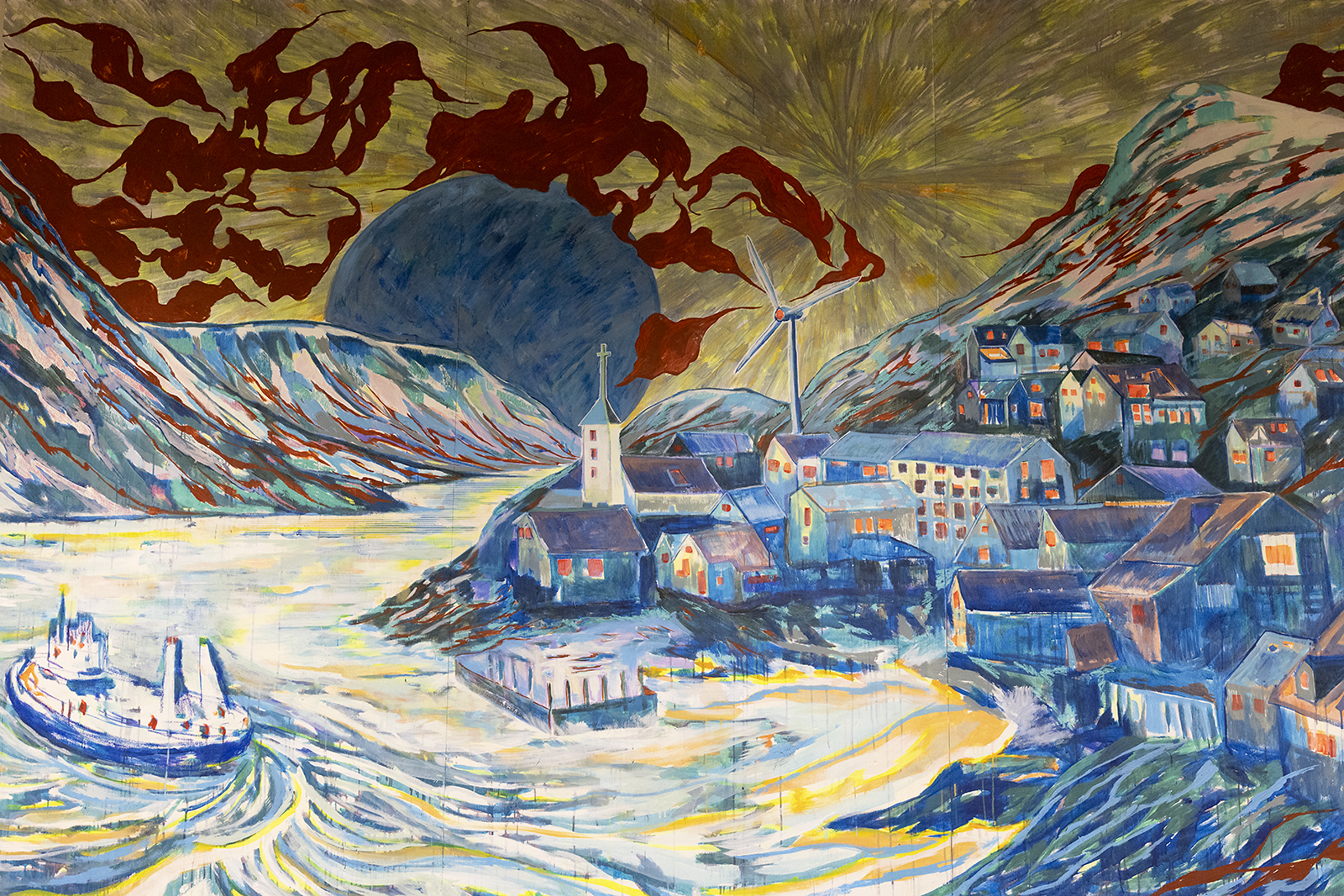 “Myndirnar eru meira jørðnærar í báðum endunum. Kropparnir eru meira defineraðir, tættari at hvørjum øðrum. Har eru áskoðarar, fjepparar, fólk ið stuttleika sær, fólk ið reflektera. Her havi eg eisini málað mosa í mynstrum, sum hann veksur ymsastaðni í Føroyum. Og grót.