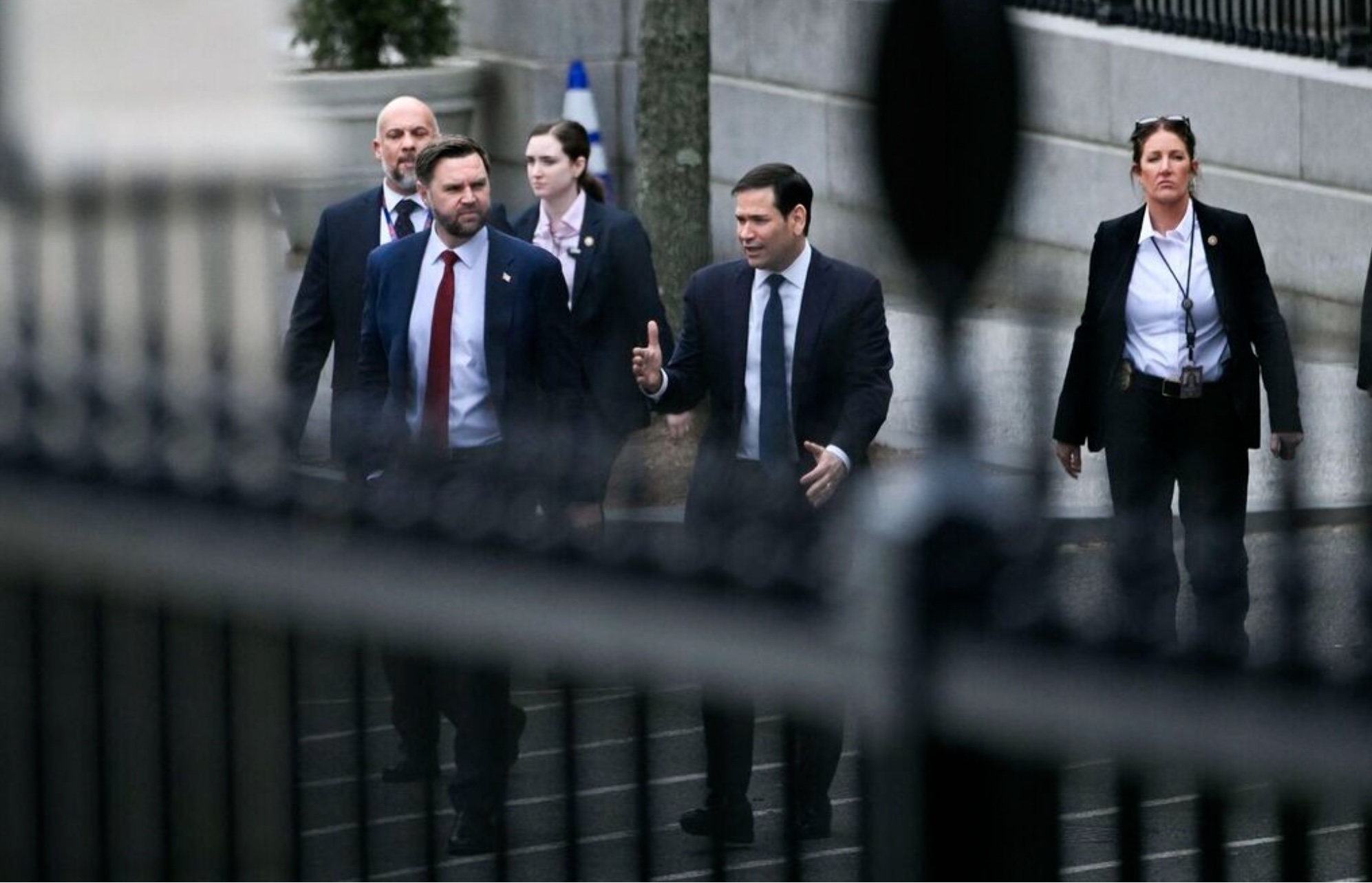 Grønlendska uttanríksiráðfrúan, Vivian Motzfeldt, danski uttanríkisráðharrin, Lars Løkke Rasmussen, amerikanski varaforsetin, J.D. Vance, og amerikanski uttanríkisráðharrin, Marco Rubio, tá partarnir hittust at tosa um Grønland í Washington 14. januar