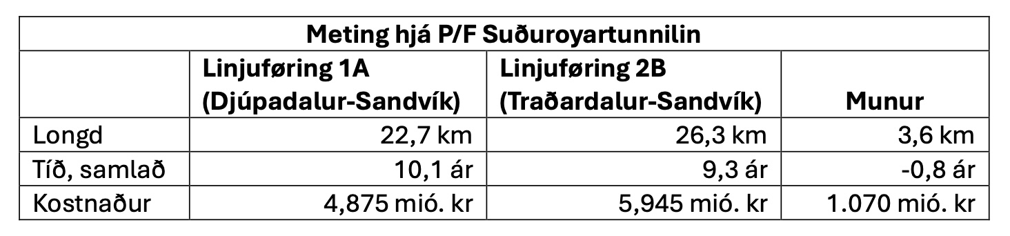 Fyri linjuføring 1A (Djúpadalur-Sandvík) er metingin 4,914 mió. kr., sum er 39 mió. kr. meir enn metingin hjá P/F Suðuroyartunlinum. Metingin hjá 3 parti fyri linjuføring 2B (Traðardalur- Sandvík) er 6,072 mió. kr., sum er 127 mió kr. meiri, í mun til metingina hjá P/F Suðuroyartunlinum.