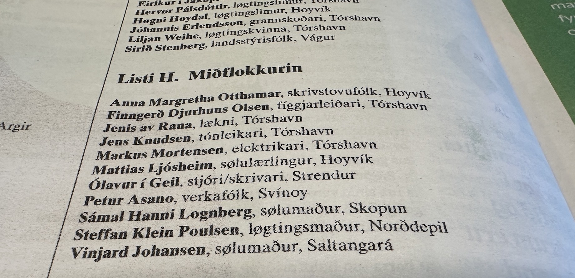 Listin varð annars kunngjørdur í Sosialinum í síðstu viku, og har standa bara 11 nøvn á, hóast Miðflokkurin hevur boðað frá, at 16 av teimum 17, sum stilla upp til løgtingsvalið, eisini stilla upp til fólkatingsvalið.