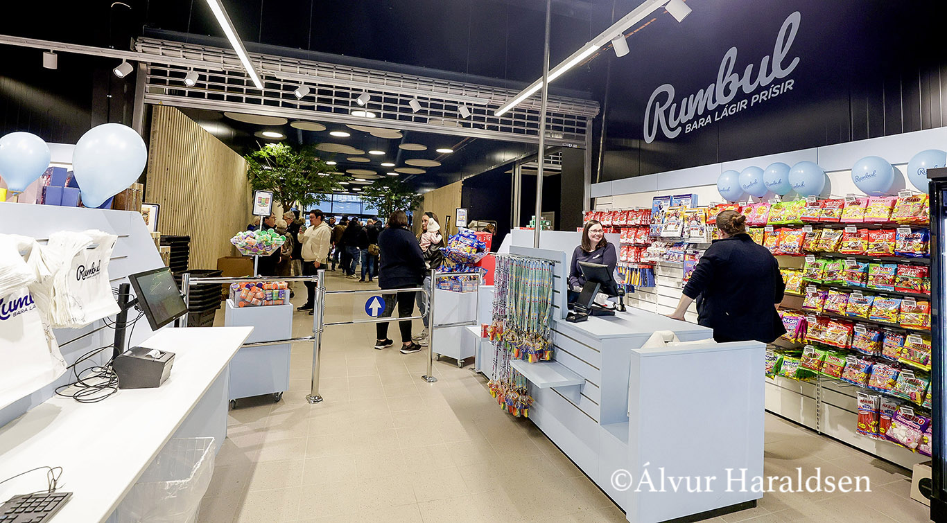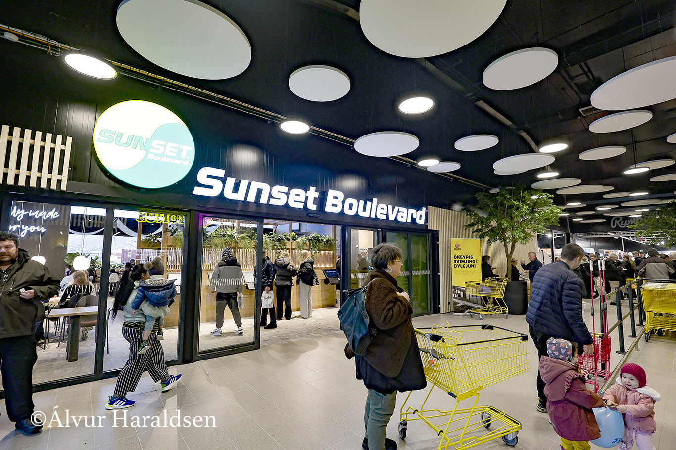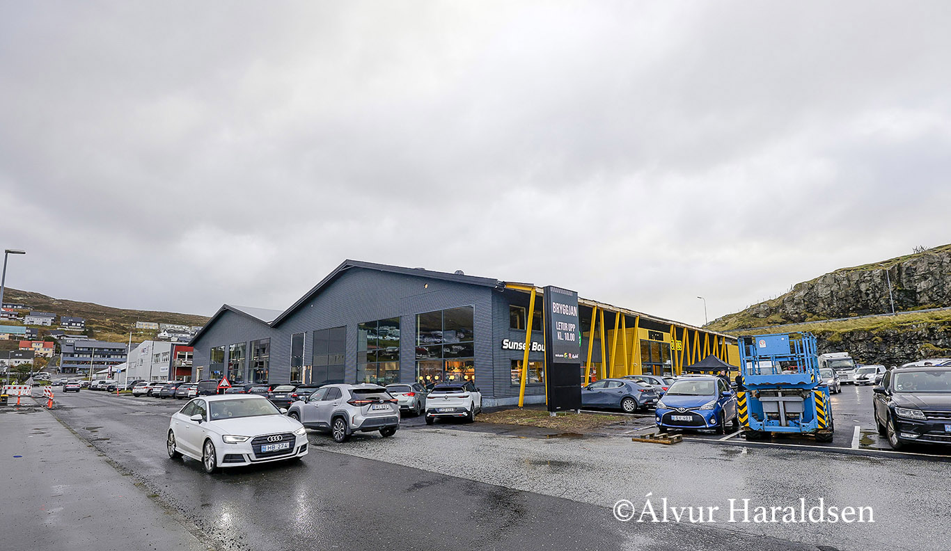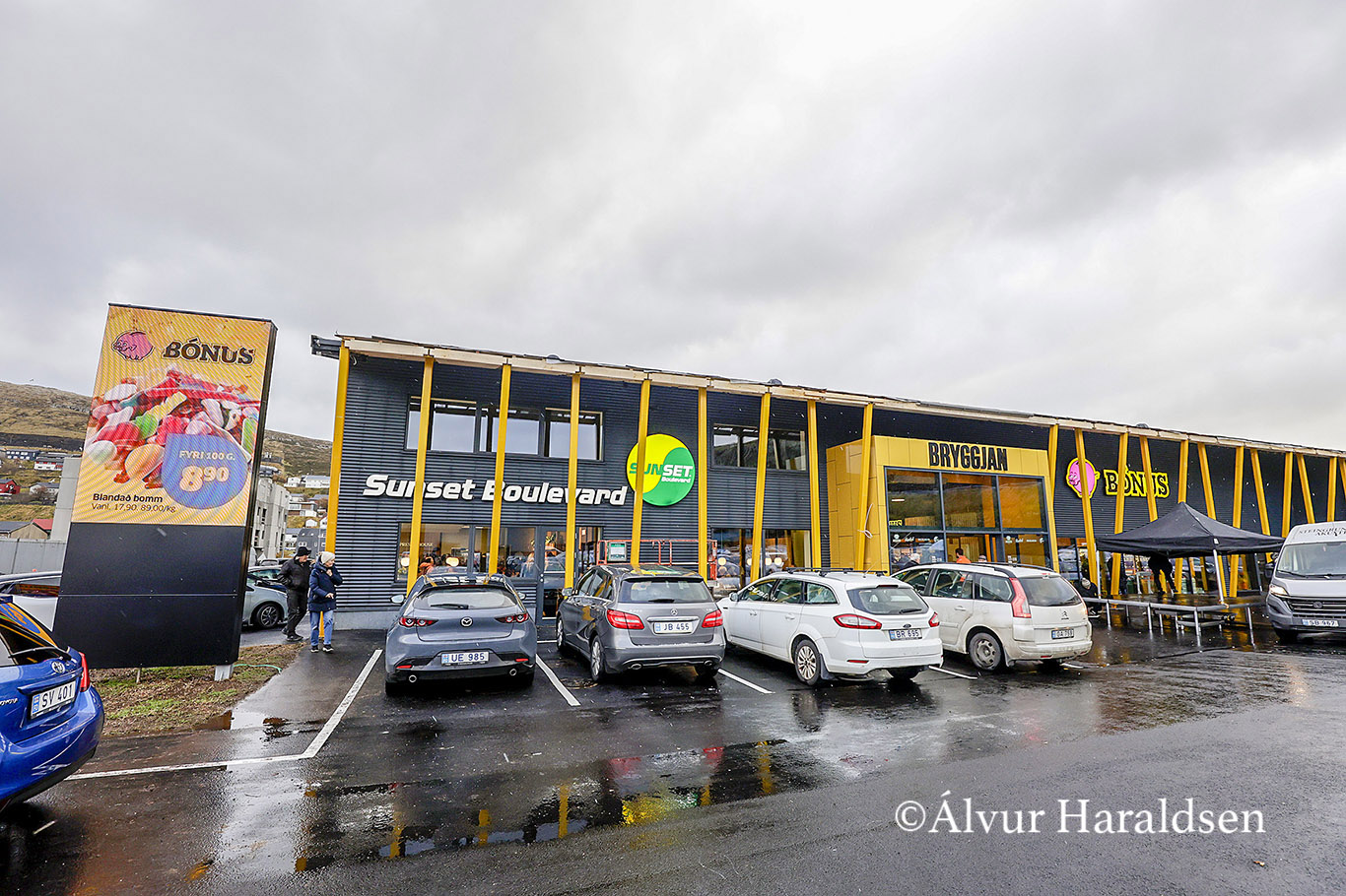 Handilsbygningurin Bryggjan í Runavík latin upp í dag. í bygninginum eru Bónus, Rumbul, Skálkur og Sunset.