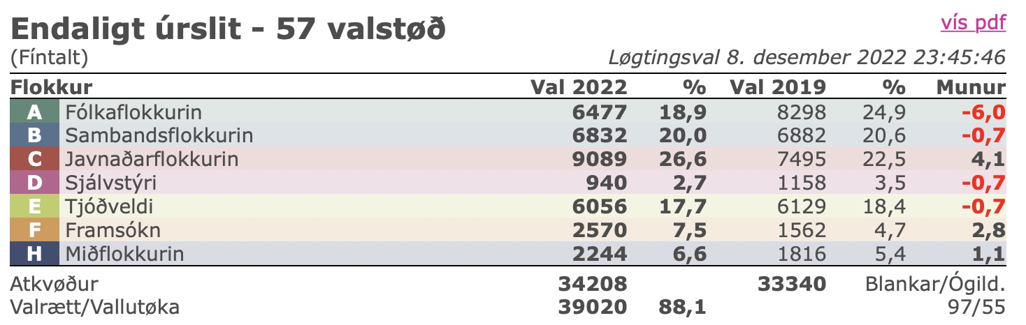 | 20 | Fólkaflokkurin | Jørgen Niclasen | 393 |