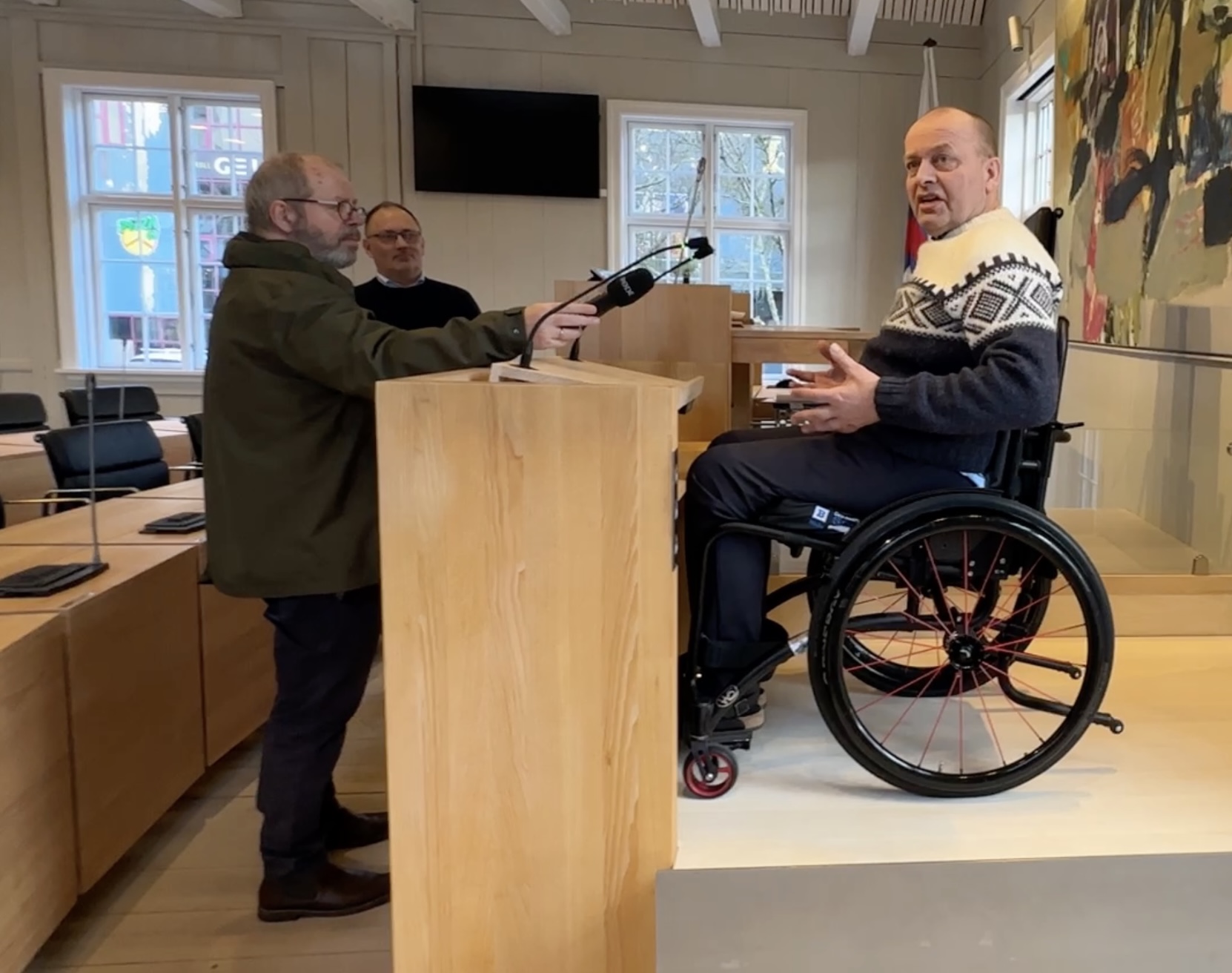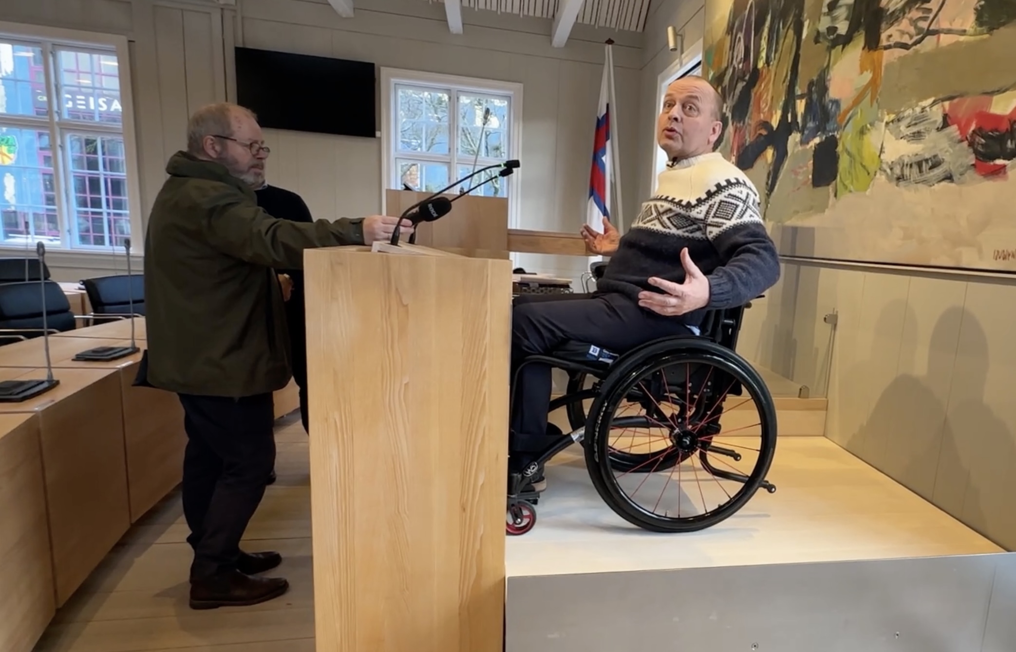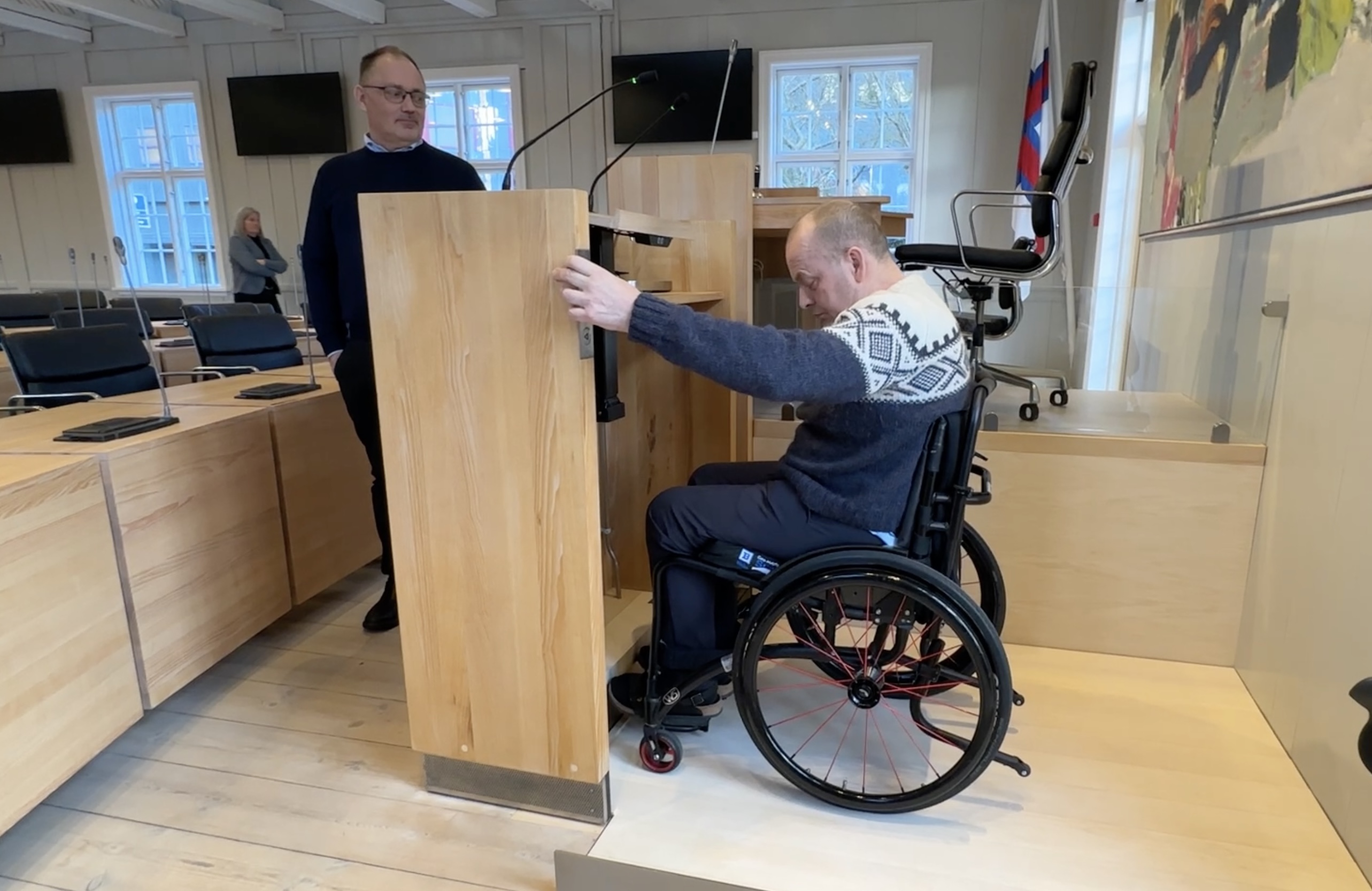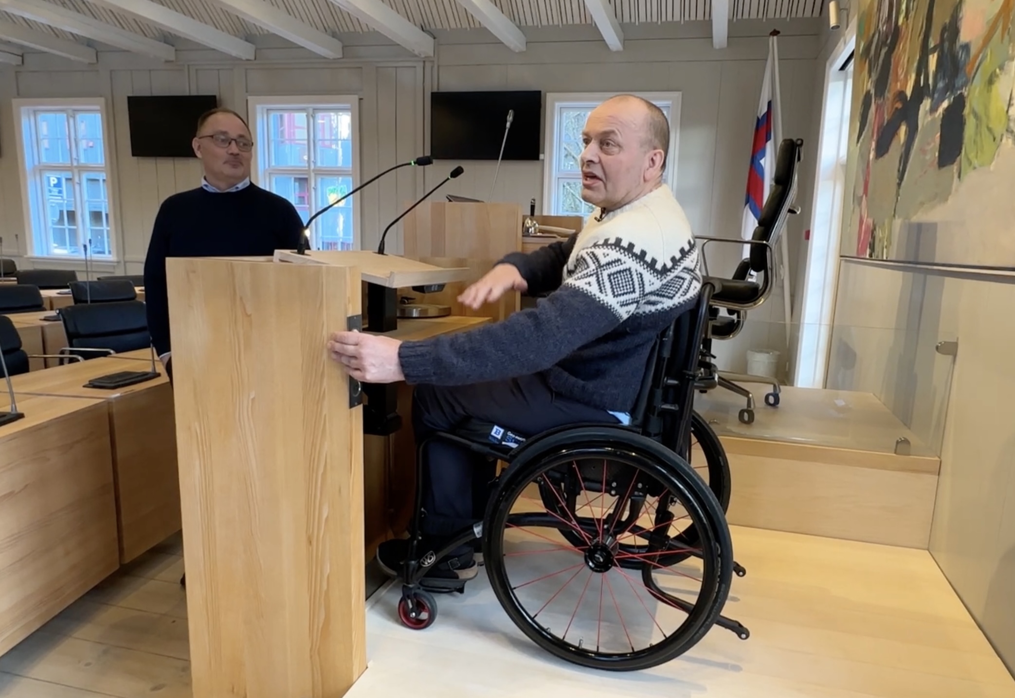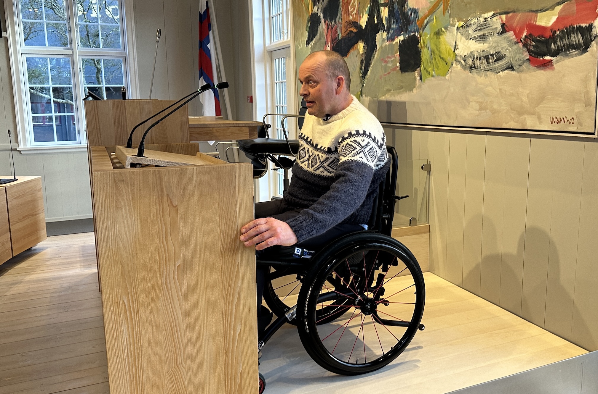Arbeiðið hevur verið darvað, tí tað eru ikki so nógvir veitarar, sum kunnu gera arbeiðið, og tí at ymsar tekniskar broytingar skuldu gerast í kjallaranum, tí at ventilatiónsskipanin lá beint undir røðarapallinum. Men nú er arbeiðið gjørt, og nú kunnu rørslutarnað í koyristóli nýta røðarapallin – men ikki nóg mikið við tí. Tað er eisini gjørt soleiðis, at tað slepst eisini upp á formanspallin við lyftini. So um ein persónur við rørslutarni gerst løgtingsformaður, so er atkomuligheitin heldur ikki longur ein trupulleiki.