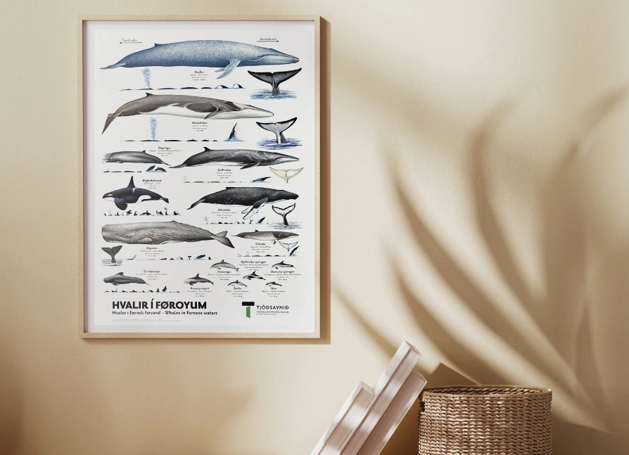 Yvirlitið yvir hvalir í Føroyum verður prentað í fleiri útgávum. Ein A1 plakat, sum er væl egnað til undirvísing og kunning, og er serliga ætlað skúlum og stovnum. Ein A2 plakat í sama sniði, sum hevur somu stødd, sum undanfarnar plakatir við fiskum, blómum og fuglum, ætlað sum veggjaprýði. Og eitt laminerað A4-eyðkennisblað við myndum á báðum síðum. Hetta er gott at hava við sær umborð á báti ella skipi, ella tá tú ert til gongu fram við sjóvarmálanum.