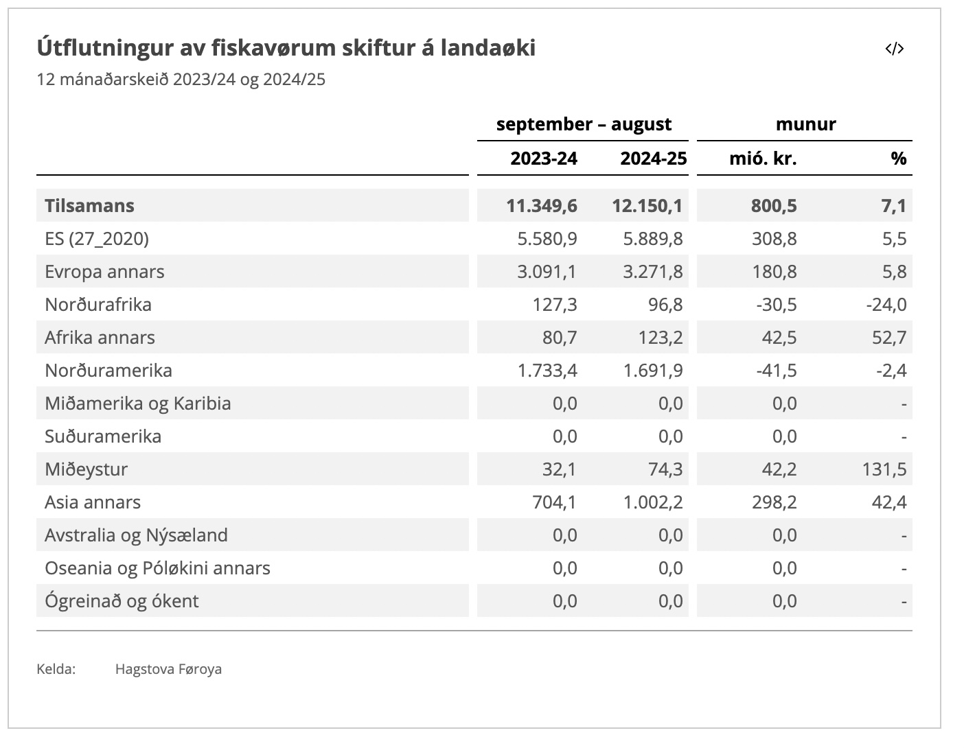 Útflutningurin fyri august er nú gjørdur upp, og í talvunum niðanfyri ber til at síggja útflutningin fyri tíðarskeiðið september 2024 til august 2025 samanborið við undanfarna tíðarskeiðið.