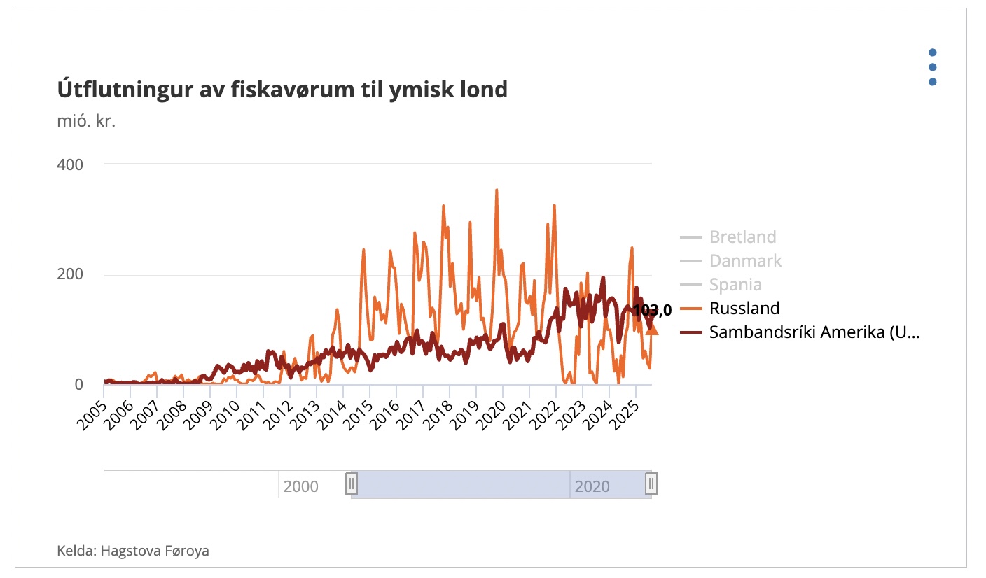 Fimm lond keypa vørur fyri yvir eina milliard krónur um árið úr Føroyum. Hesi eru USA, Bretland, Russland, Danmark og Spania. Útflutningurin til Russlands fór niður á eitt lægri stig, tá laksaútflutningurin til Russlands steðgaði í 2022, men tendensurin er nú vaksandi, og útfluttu vit fyri 103 milliónir krónur til Russlands í august í ár. Útflutningurin til USA var í hæddini miðan 2023. Síðani tá hevur gongdin verið minkandi. Útflutningurin til USA var 136 milliónur krónur í august 2024 og er komin niður á 125,4 milliónur krónur í august 2025. Hetta er ein lækking á sløk 8 prosent.