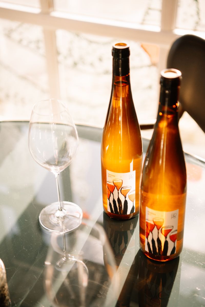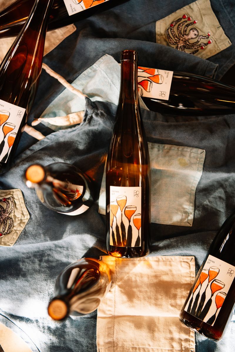 Eitt av hansara listaverkum – ein hond við vínglasi – er valt at prýða seðilin á nýggju vínfløskuni. Soleiðis sameinast vín, list og matmentan í einari heildaruppliving.