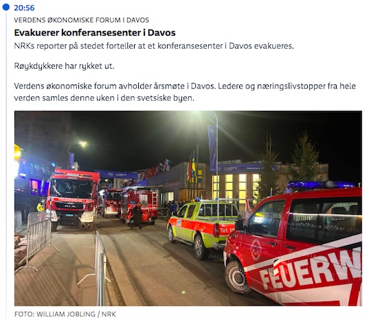 NRK veit í kvøld at siga, at luttakararnir á toppfundinum í World Economic Forum, sum í hesum døgum er í Davos í Sveis, eru fluttir úr ráðstevnuhølunum.