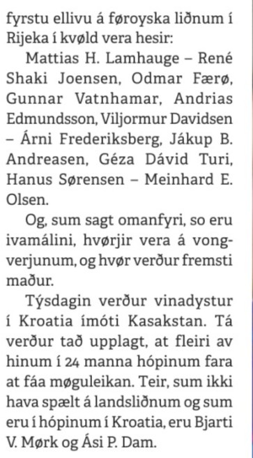 Eyðun Klakstein landsliðsvenjari og hansara menn leggja í løtuni síðstu hond á fyrireikingarnar undan stóru uppgávuni í Rijeka í Kroatia, og liðið sær soleiðis út, sum tað hevur verið roknað við.